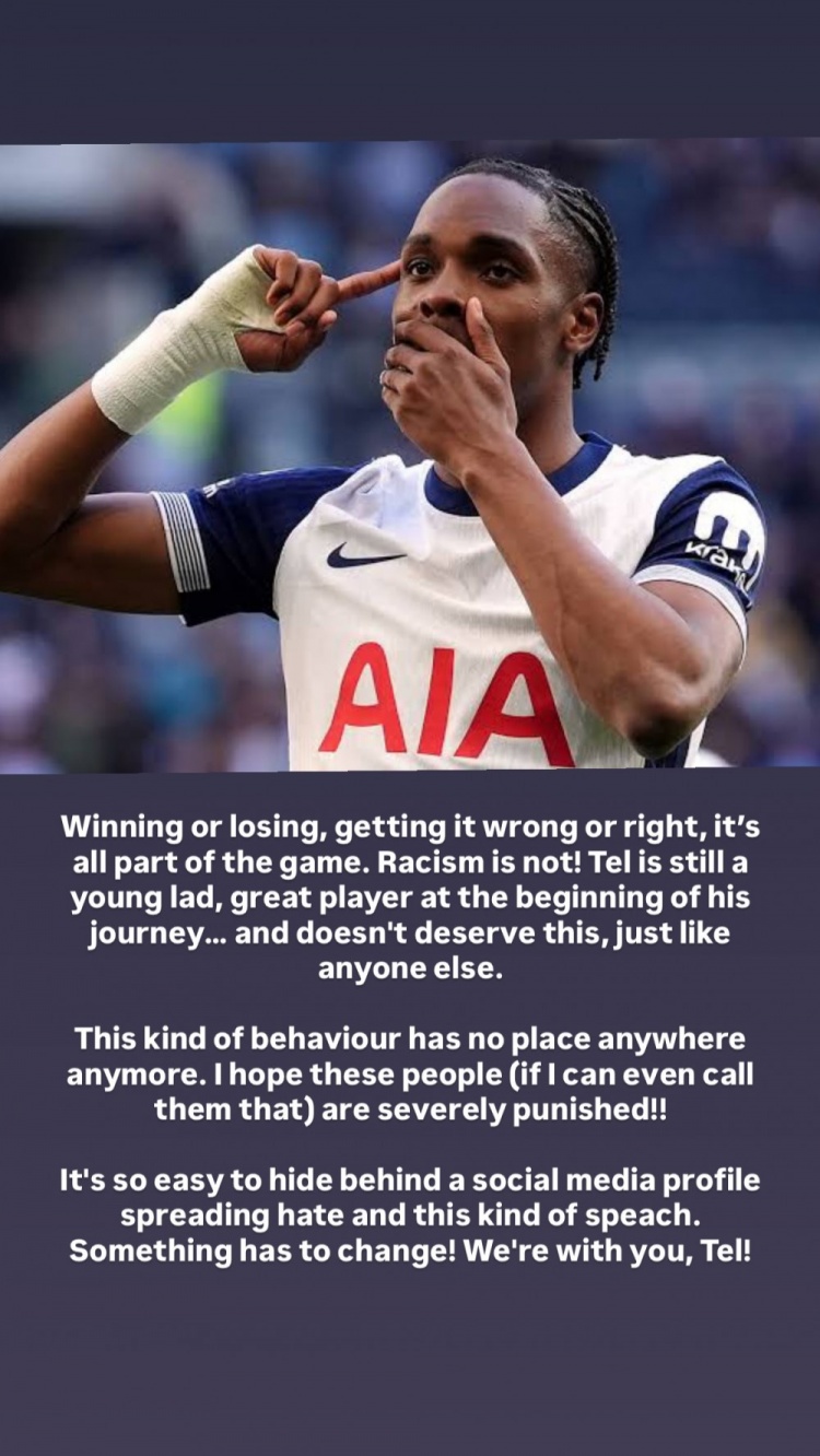 8月15日,托特纳姆热刺球员理查利森通过社交平台发声,力挺遭受种族歧视的年轻队友特尔。